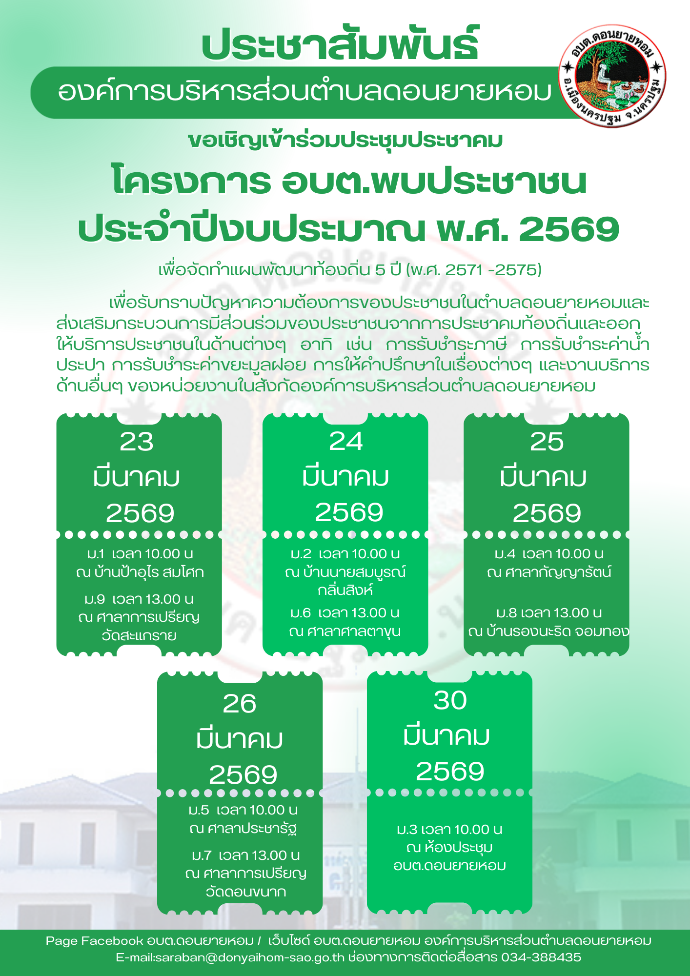 นายอาบ ร่อนอบ นายกองค์การบริหารส่วนตำบลดอนยายหอม ดำเนินการจัดประชุมประชาคม โครงการ อบต.พบประชาชน ประจำปีงบประมาณ พ.ศ.2569 เพื่อจัดทำแผนพัฒนาท้องถิ่น 5 ปี (พ.ศ.2571-2575) เพื่อรับทราบปัญหาความต้องการของประชาชนในตำบลดอนยายหอมและส่งเสริมกระบวนการมีส่วนร่วมของประชาชนจากการประชาคมท้องถิ่นและออกให้บริการประชาชนในด้านต่างๆ เช่น การรับชำระภาษี การรับชำระค่าน้ำประปา ค่าขยะมูลฝอย พร้อมให้คำปรึกษาในเรื่องต่าง ๆ